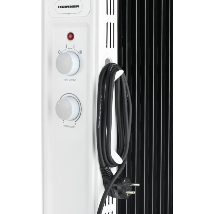 Oil-Filled Radiator Heinner HOH-M13WH-BK, 13 Elements, 1000/1300/2500 W, Adjustable Thermostat, Overheating Protection, Tip-Over Protection, Wheels, Cable Storage, White with Black