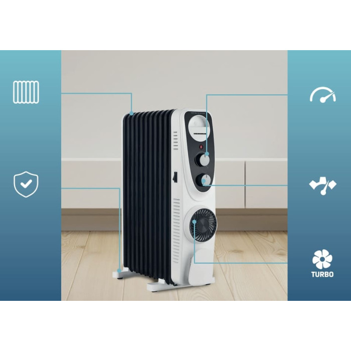 Oil-Filled Radiator Heinner HOH-MVT11WH-BK, 2300W, 11 Elements, Turbo Fan, 3 Heat Settings, Adjustable Thermostat, Overheating Protection, White/Black