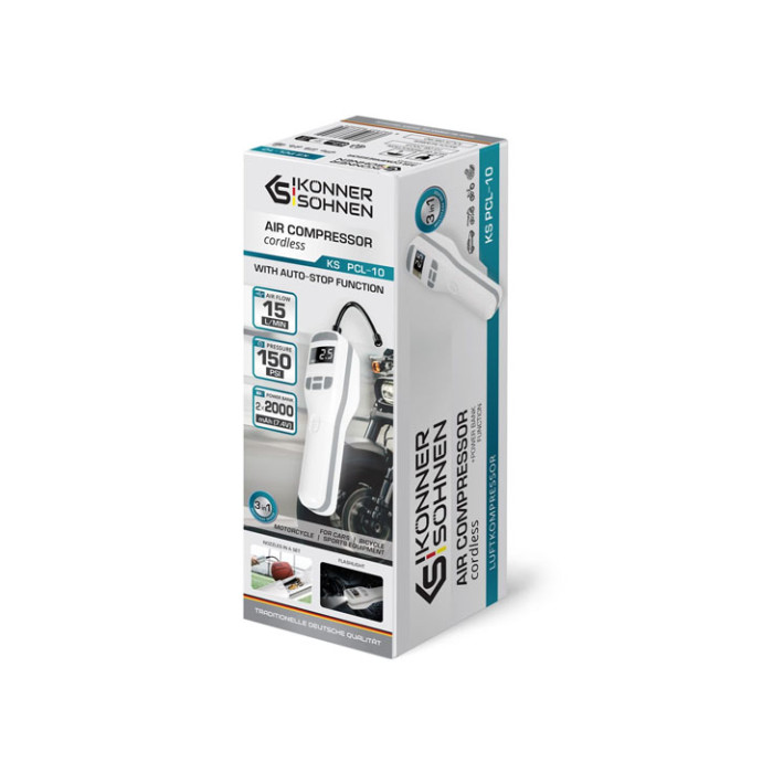 The Könner & Söhnen® KS PCL-10 air compressor is a versatile tool that serves as a wireless car compressor, power bank, and LED flashlight, making it an essential device for a variety of users, from vehicle owners to sports enthusiasts. It inflates quickly without needing external power, thanks to a 15L/min inflation speed and a battery-operated design.