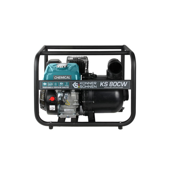 The KS 80CW motor pump from Könner & Söhnen is ideal for transferring aggressive fluids like seawater and weak acids (excluding highly reactive or flammable substances). After starting the engine, allow the pump to run for about 30 seconds, then stop the engine and add more water to the pump to increase its efficiency and continue working.