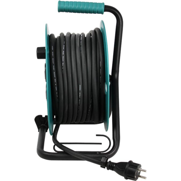 This reel is equipped with a 100% copper cable, ensuring excellent durability and long service life. The reel frame is made from plastic, and it features an ergonomic rubber-covered handle for easy transportation. A cable holder located on the bottom of the reel allows easy and secure unwinding and rewinding of the cable, as well as safe and quick storage or transportation. The reel is also equipped with 4 sockets with protective covers for additional safety.