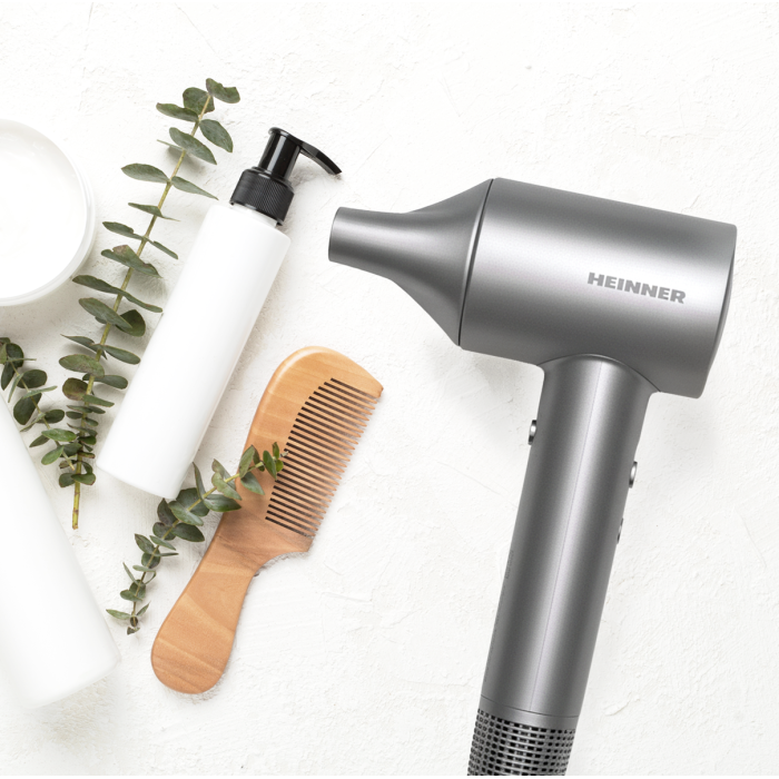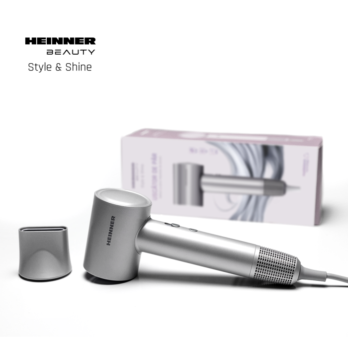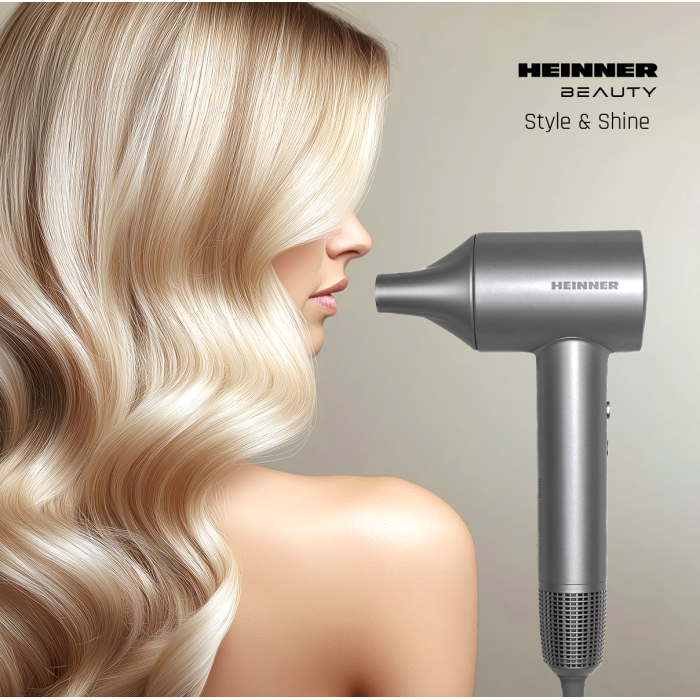 Heinner HHD-H16BLDC-GY professional hair dryer with a powerful 1600 W BLDC motor ensures fast drying and efficient styling. Heat Balance Technology helps distribute heat evenly, while negative ion technology reduces frizz and enhances hair shine.