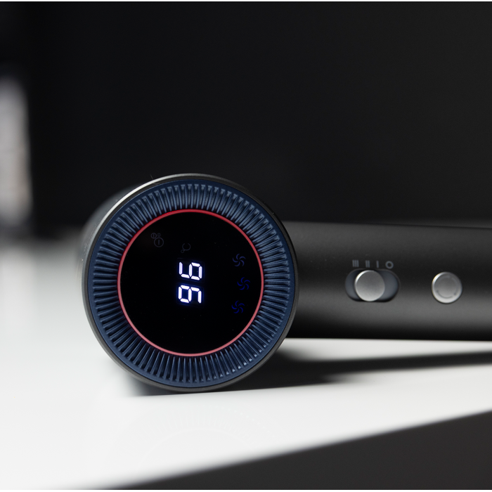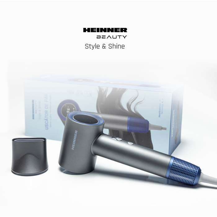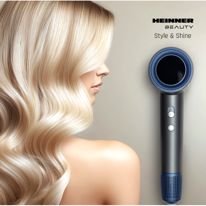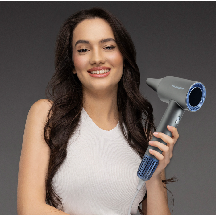Heinner HHD-H17DBLDC-GY professional hair dryer with a powerful 1700 W BLDC motor ensures fast drying and precise styling. Heat Balance Technology distributes heat evenly, while negative ion technology helps reduce frizz and enhances hair shine. The built-in display allows easy control of settings.