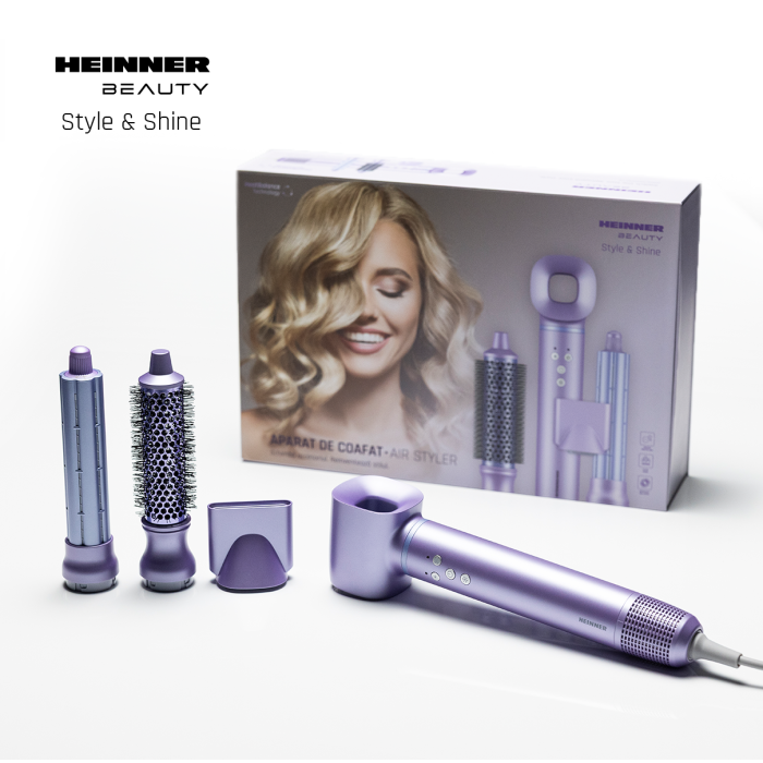 Heinner HAS-H13BLDC-V4 professional air styler with a powerful 1300 W BLDC motor ensures fast drying and versatile styling. Negative ion technology helps reduce frizz and enhance hair shine, while multiple accessories allow curling, drying, and styling with ease.