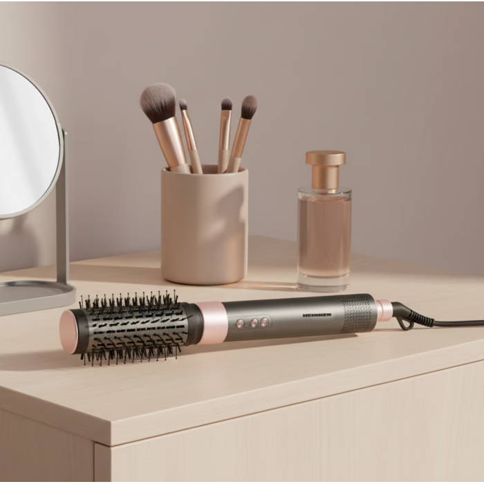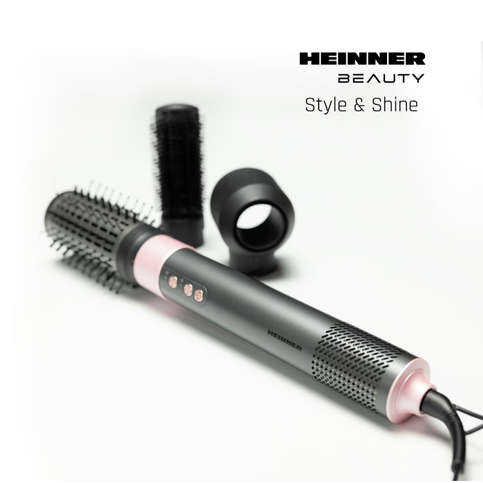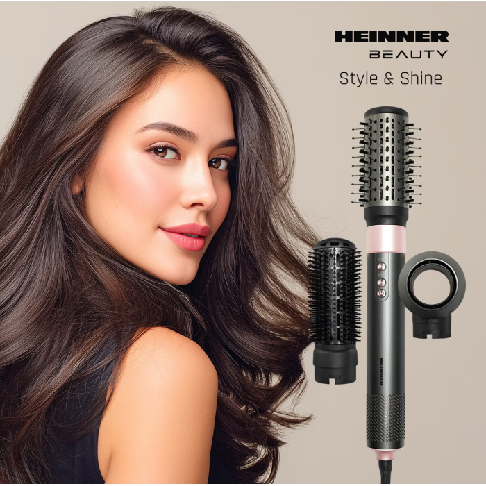 Heinner HAS-Y15BLDC-GY3 professional air styler with a powerful BLDC motor and adjustable 1300–1500 W power ensures fast drying and versatile styling. Negative ion technology helps reduce frizz and enhance hair shine, while multiple accessories allow drying, straightening, and volumizing.