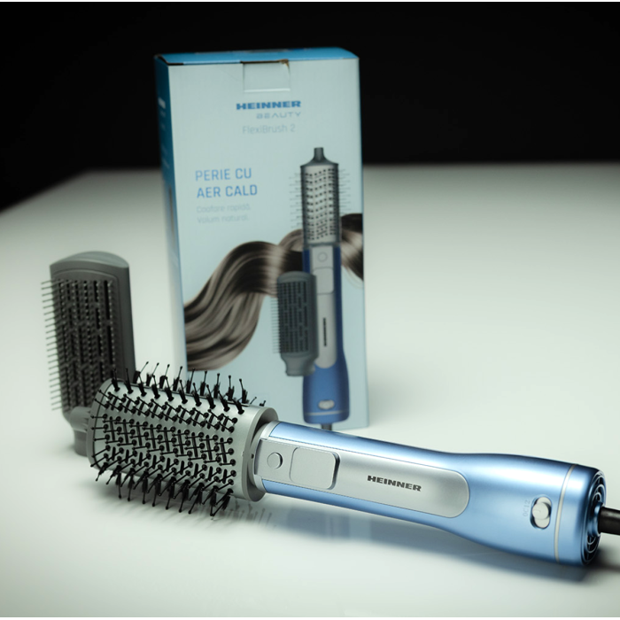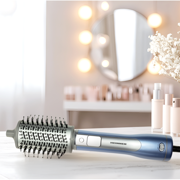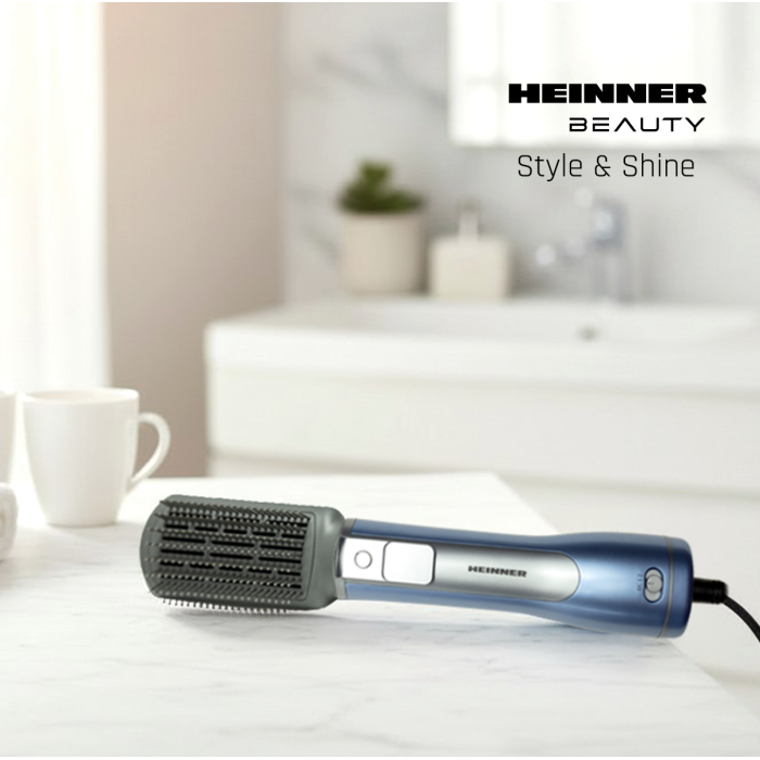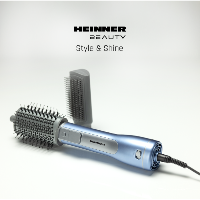 Heinner HAB-R12DC-BL2 hot air brush with negative ion technology helps reduce frizz and add shine while styling. The 1200 W DC motor provides efficient drying and styling, while two interchangeable accessories allow both smoothing and volumizing.