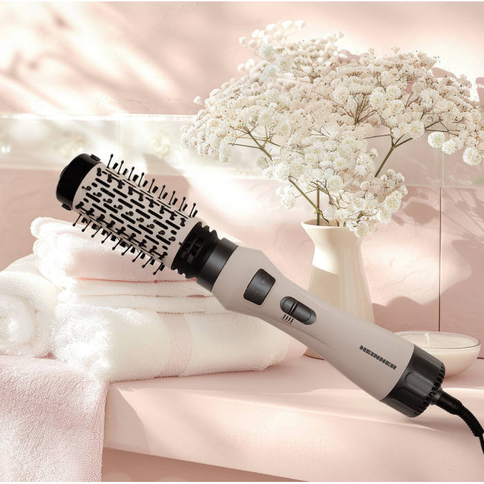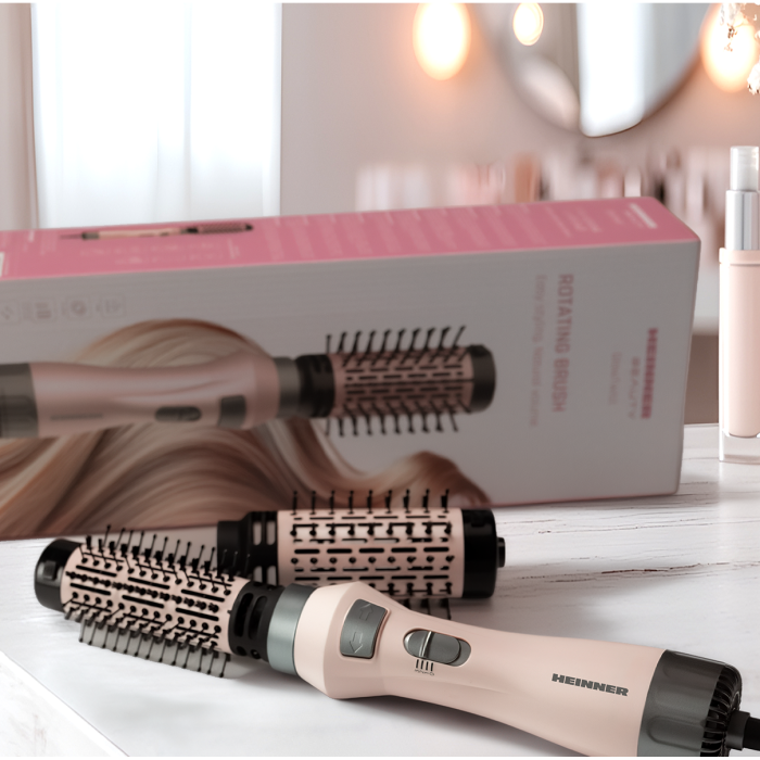 Heinner HAB-R12RDC-PNK2 rotating hot air brush with a 1200 W DC motor is designed for easy hair drying and styling. The ceramic-coated rotating brushes can rotate left and right for convenient styling and volume.