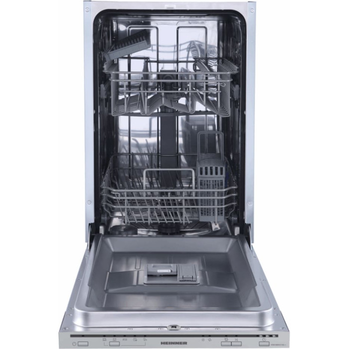 Built in dishwasher Heinner HDW-BIM45510E++, 10 place settings, energy efficiency class E, electronic control, 5 washing programs, Rapid program 30’, 90 min. program, Intensive program 65°C, delay timer option (3/6/9H), half load option, Extra drying option, adjustable upper basket (when it’s empty), lower basket: 2 foldable plate supports, protection against water damage – Aquastop, water consumption: 9L/washing cycle, dimensions (WxDxH): 45 x 55 x 82 cm