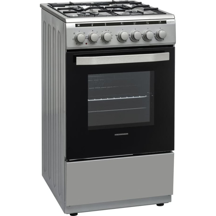 Combined gas cooker Heinner HFSC-V60LITGC-SL, 50x60cm, 4 Gas burners, Enamel pan support, Glass lid, Auto ignition for hob, Gas safety hob, Electric oven, 6 Functions, Timer, Grill, Fan, Defrost, Interior oven light, Removable double glass oven door, Bottom drawer, NG settled, Spare LPG nozzles included, Oven tray and grid, Dimensions (WxDxH): 50x60x85 cm, Color: Silver