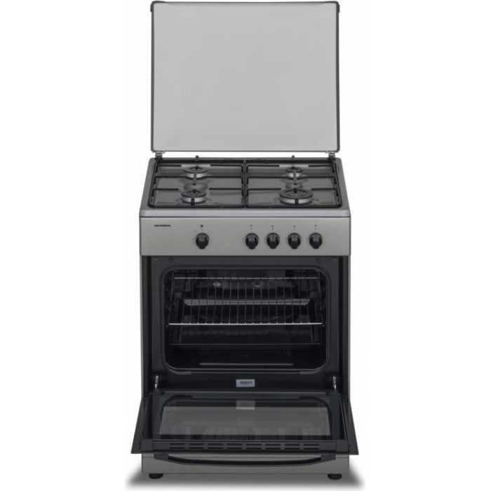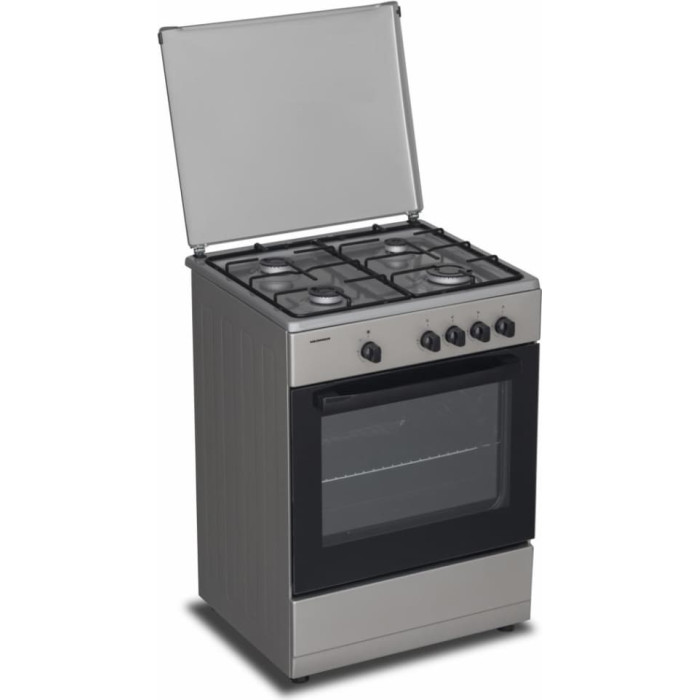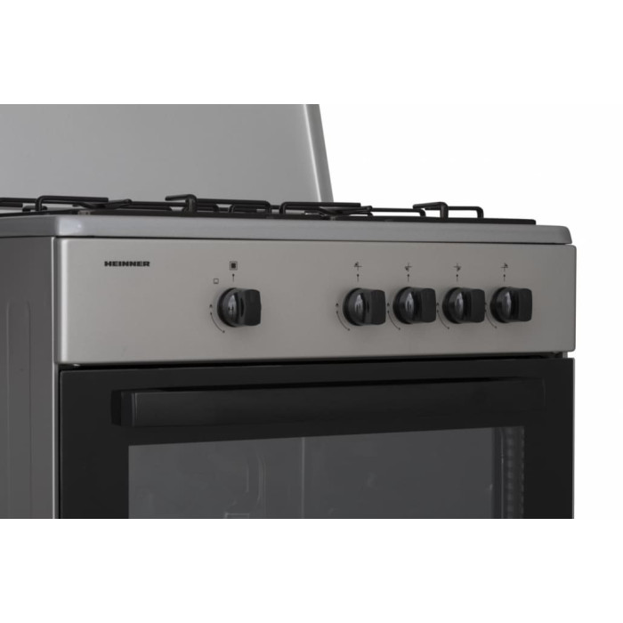 Gas cooker Heinner HFSC-SME60SL, 60 × 55 cm, 4 gas burners, Enamel pan supports, Metal lid, Gas safety device for hob and oven, Double-glass oven door, NG (natural gas) set-up, Spare LPG nozzles included, Oven tray and grid, Dimensions (W × D × H): 60 × 55 × 85 cm, Colour: Silver.