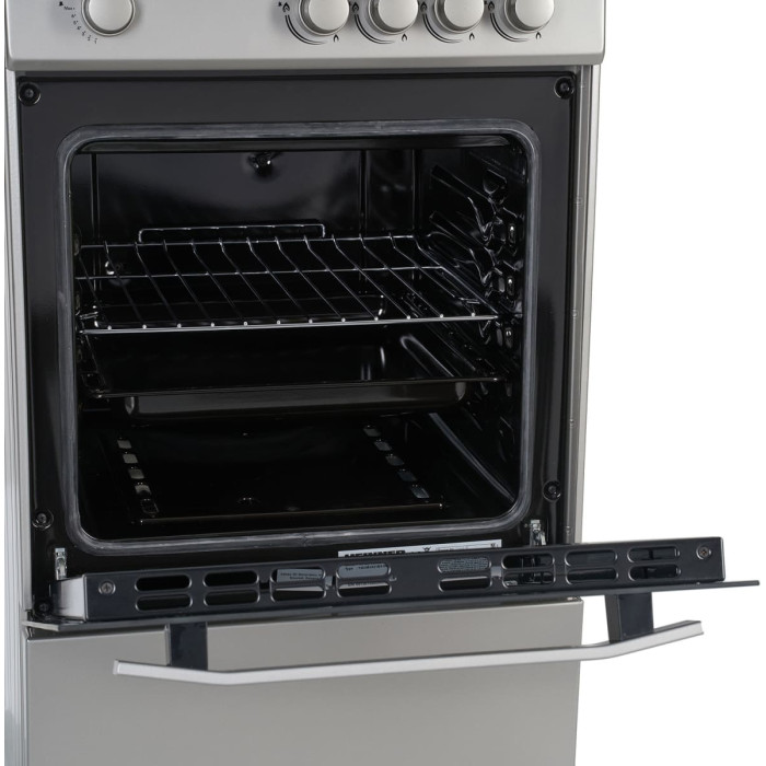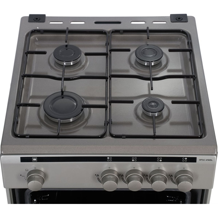 Gas cooker Heinner HFSC-V50SL, 4 gas burners, Safety device for hob and oven, Width 50 cm, Colour: Silver. Dimensions (W × D × H): 50 × 49.5 × 85 cm.
