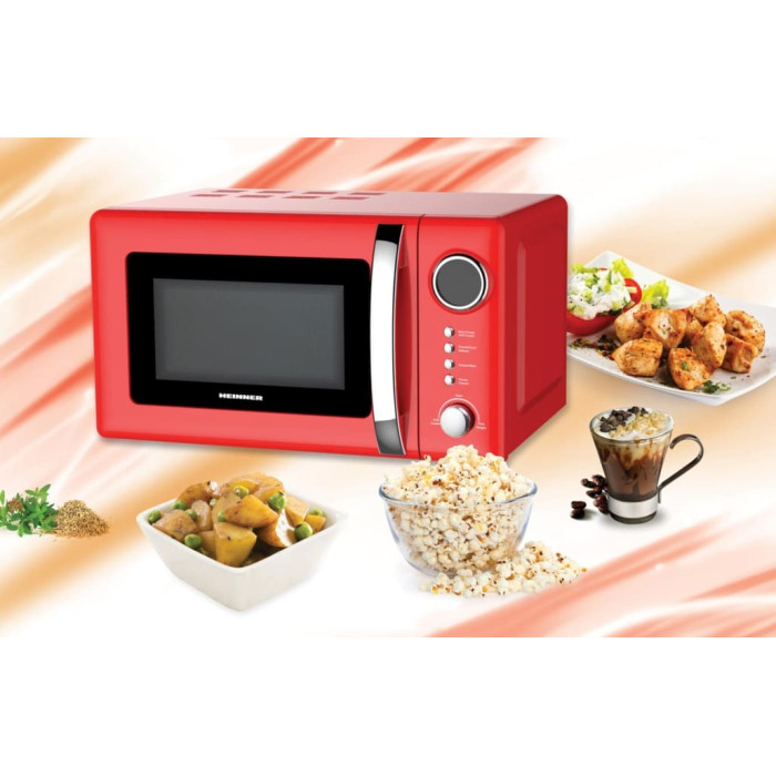 Microwave oven Heinner HMW-20GRD, Capacity 20L, Digital control, LED display, 700W microwave power, 800W grill power, 5 power levels, 12 auto cooking menus, 60 min cooking time, Defrost function, Cooking end signal, Child lock function, Turntable glass tray 245mm, Chromed handle door, Dimensions (WxDxH): 45.1x34.5x25.8 cm, Color: Red