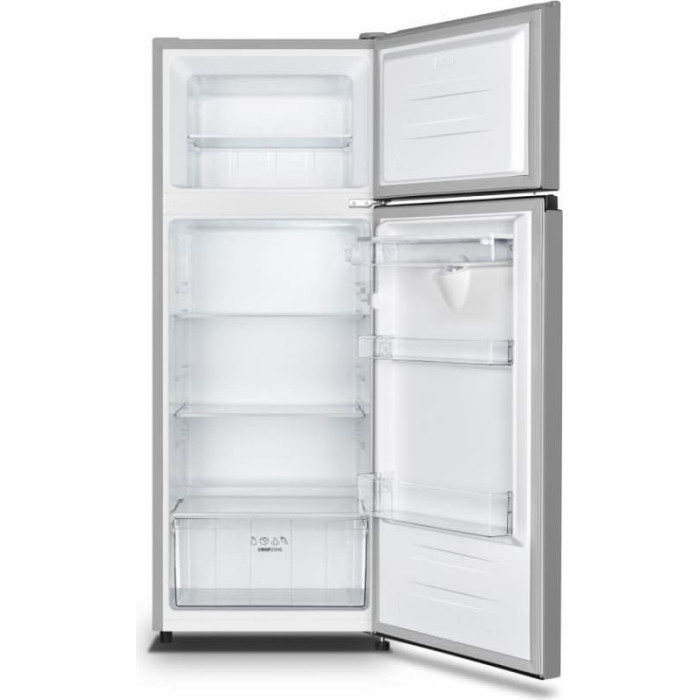 Double door refrigerator Heinner HF-HS205SWDE++, energy efficiency class: E, water dispenser, total capacity: 206L, fridge capacity: 165L, freezer capacity: 41L, mechanical control with adjustable thermotstat, LED light, 2 fridge glass shelves, 1 compartment for fruits and vegetables, reversible doors, egg tray, ice cube tray, freezing capacity: 2Kg/24h, dimensions (WxDxH): 55 x 54.2 × 143.4 cm, color: Silver with stylish black handle