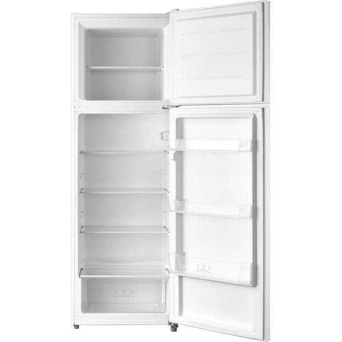 | Interior layout | 3 glass shelves in fridge, crisper drawer (fruits/vegetables), door bins; freezer shelf/tray; egg tray / ice tray included |