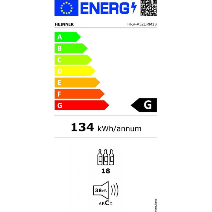Heinner HRV-A52DRM18 is a compact wine cooler with 55 L capacity, designed to store up to 18 bottles. It features single-zone cooling, LED display, electronic control, and elegant black finish.