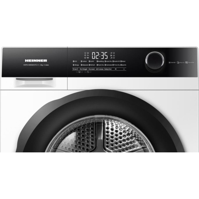 Heinner HHPD-HMK90IVFC+++ heat pump dryer, 9 kg capacity, energy class C, inverter motor, touch control, dryer light, 30-minute quick program, baby care program, wool program, eco program, 14 programs, shoe support, delayed start function, anti-syphoning function, drying level selector, humidity sensor, child lock, lint filter cleaning indicator, water collection tank full indicator.