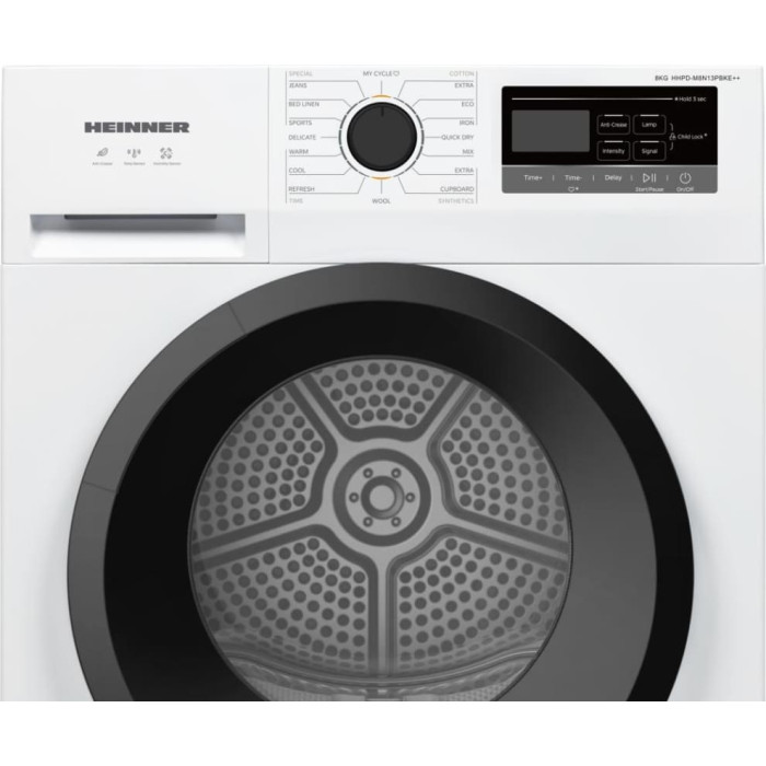Tumble Dryer with Heat Pump HEINNER HHPD-M8N13PBKE++, Load Capacity: 8 kg, Energy Efficiency Class: E, 16 Drying Programs, LED Display, Quick Shirts Program, Delay Start Function, Anti-Crease Function, Drum Light, Drying Level Selector, Lint Filter Cleaning Indicator, Full Water Tank Indicator, Plastic Door Porthole, Child Lock, Dimensions (W × D × H): 59.5 × 60 × 85 cm, Color: White