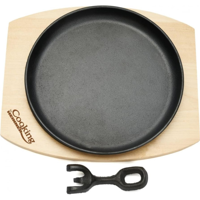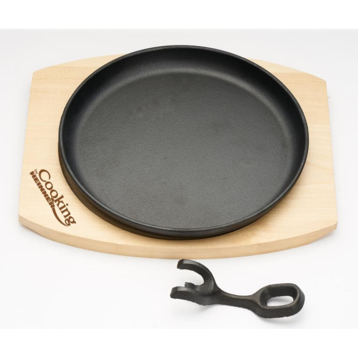 Round steak pan 22 cm with detachable handle and wooden base, cast iron. Food served in cast iron cookware is more aromatic, juicier, tastier and healthier. Cast iron has a high heat capacity. Cast iron products are suitable for induction hobs. Care instructions: Before first use, wash the product with water and liquid detergent, then coat the interior with oil. Do not overheat the product when empty. Dishwasher safe.