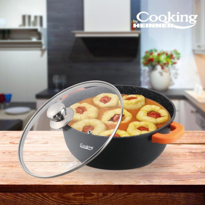The DARK LINE large-capacity casserole is designed for family meals and large-batch cooking. The cast aluminum body ensures even heat distribution, while the black marble-effect ceramic interior coating prevents food from sticking and allows healthier cooking with reduced fat.