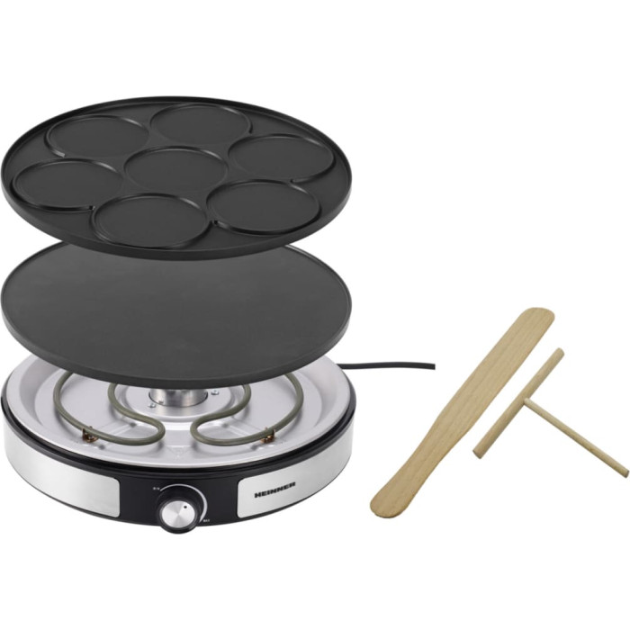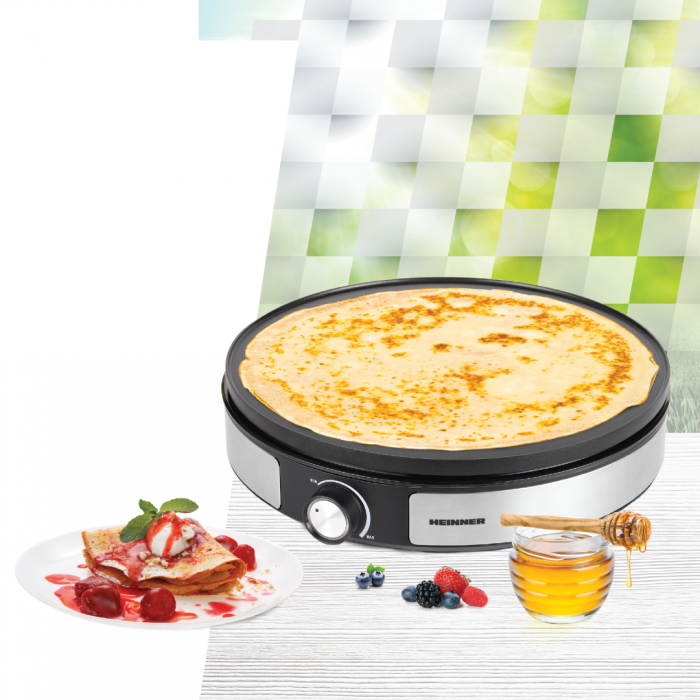 Heinner HCPM-F15RVSS is a versatile 2-in-1 crêpe maker with a reversible 33 cm plate. It features non-stick coating, adjustable temperature control, and practical accessories for easy and precise crêpe preparation.