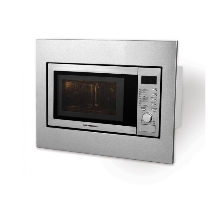 Iebūvējamā mikroviļņu krāsns Heinner HMW-23BI, ietilpība: 23L, digitālā vadība, LED displejs, mikroviļņu jauda: 800W, grila jauda: 1000W, 5 jaudas līmeņi, gatavošanas laiks līdz 60 minūtēm, atkausēšanas funkcija, skaņas signāls programmas beigās, bērnu drošības bloķēšana, rotējošais stikla šķīvis (270 mm), izmēri (PxDzxA): 59.4x35.7x49.5 cm, krāsa: nerūsējošais tērauds.