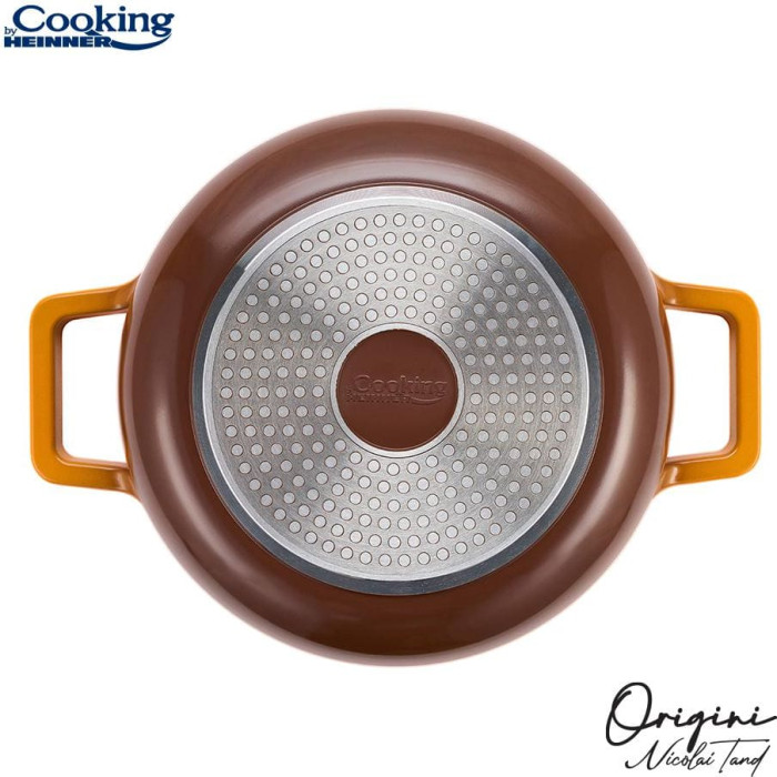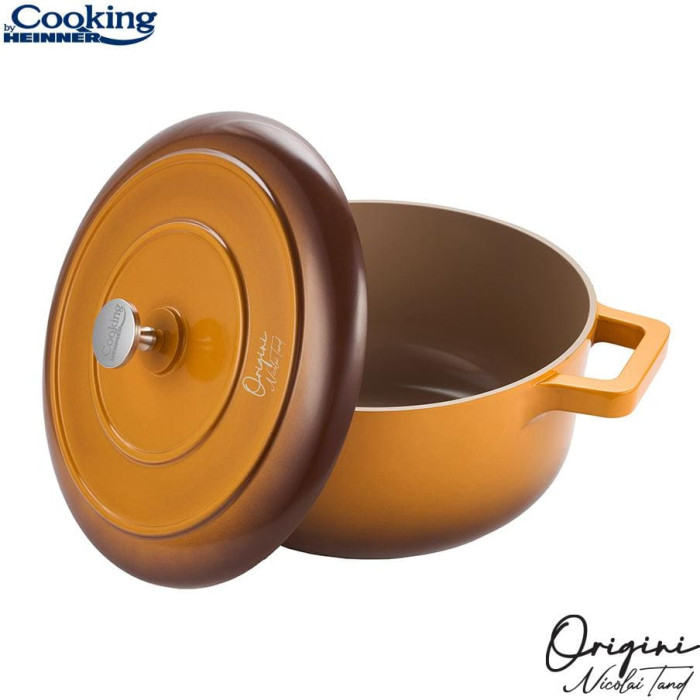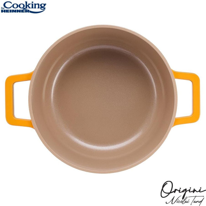 NICOLAI TAND lietā alumīnija trauku līnija ir radīta, lai jūs beidzot iegūtu uzticamu palīgu virtuvē neatkarīgi no tā, ko plānojat gatavot. Trauku iekšējā virsma ar pelēku nepiedegošu keramikas pārklājumu nodrošina paaugstinātu izturību pret piedegšanu, atvieglo tīrīšanu un ļauj gatavot bez taukiem, piedāvājot veselīgas un gardas maltītes. Trauki efektīvi saglabā siltumu, uzturot ēdienu siltu un garšīgu arī pēc gatavošanas, ievērojami samazinot gan gatavošanas laiku, gan enerģijas patēriņu. Oranžā ārējā krāsa ir izturīga pret augstām temperatūrām. Turklāt traukiem ir pamatne, kas piemērota visu veidu plītīm, tostarp INDUKCIJAI. Šī izturīgā un funkcionālā līnija ir būtiska jebkurai virtuvei. Jebkurš šīs līnijas produkts var būt lieliska dāvana jebkuram gadījumam, īpaši jaunai mājai.