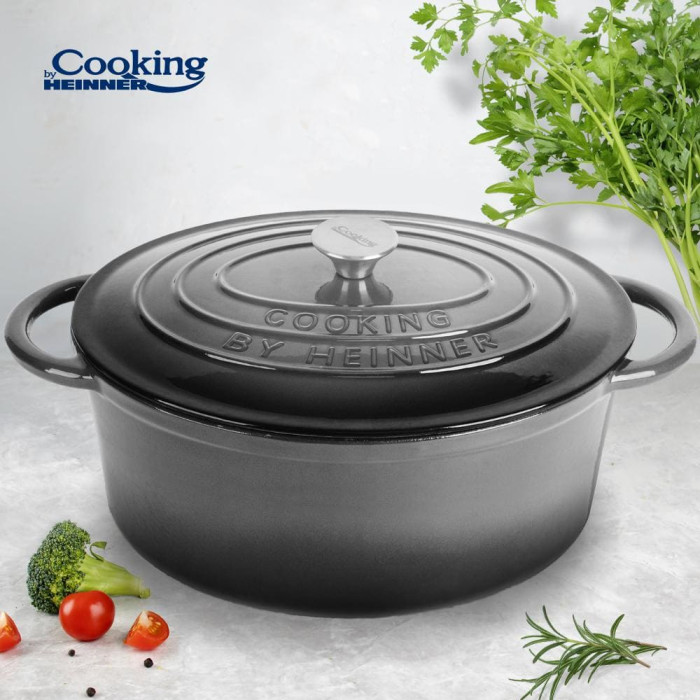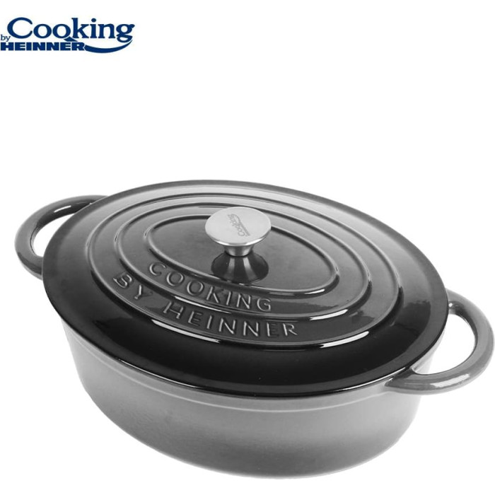 EMALJĒTS OVĀLS ČUGUNA KATLS AR VĀKU 33 x 26.5 x 11.5 CM, 6 L, MARMORA PELĒKS, COOKING BY HEINNER
