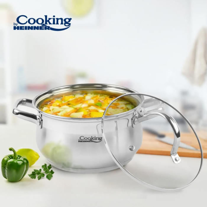 Indukcijas pamatne ir piemērota visiem plīts veidiem, savukārt karstumizturīgais stikla vāks nodrošina drošu gatavošanas kontroli. Spoguļveida iekšējā apdare un satīna ārējā virsma ar spoguļa efekta joslu piešķir katlam augstvērtīgu izskatu.
