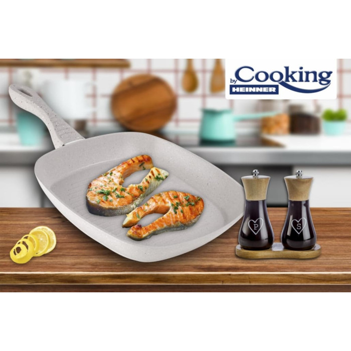 MOZAIK grila panna paredzēta veselīgai un efektīvai grilēšanai. Kaltā alumīnija korpuss nodrošina vienmērīgu siltuma sadali, savukārt marmora efekta keramikas pārklājums samazina ēdiena pielipšanu un ļauj gatavot ar mazāku tauku daudzumu.