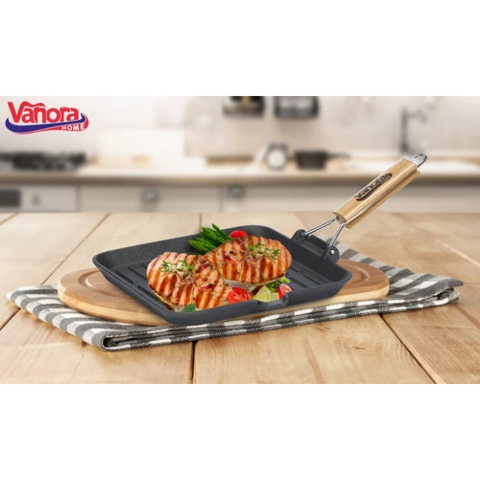VANORA čuguna grila panna ir paredzēta profesionāla līmeņa grilēšanai mājas apstākļos. Kompaktā 23 × 23 cm taisnstūrveida forma ir ideāli piemērota gaļas, dārzeņu, zivju un citu ēdienu pagatavošanai, nodrošinot izteiktas grila svītras un bagātīgu garšu.