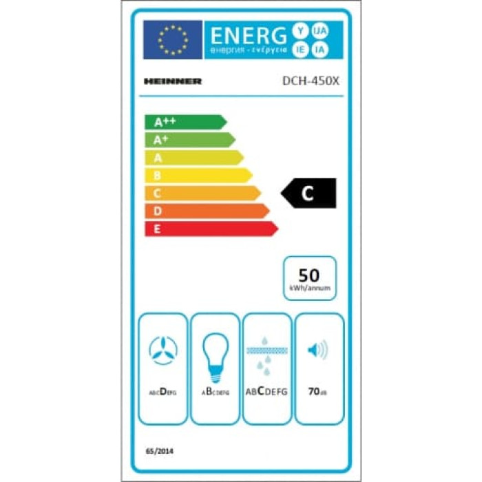 Dekoratīvais tvaika nosūcējs Heinner DCH-450X, 60 cm, Maksimālā gaisa nosūkšanas jauda 429.4 m³/h, 3 jaudas līmeņi, Motors: 1 × 105 W, LED apgaismojums, 2 alumīnija filtri, Gaisa izvades diametrs: 150 mm, Energoefektivitātes klase C, Izmēri (P × Dz × A): 60 × 47 × (50–80) cm, Krāsa: Nerūsējošais tērauds.