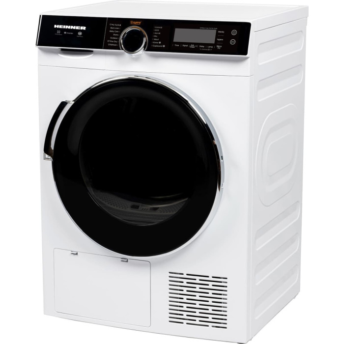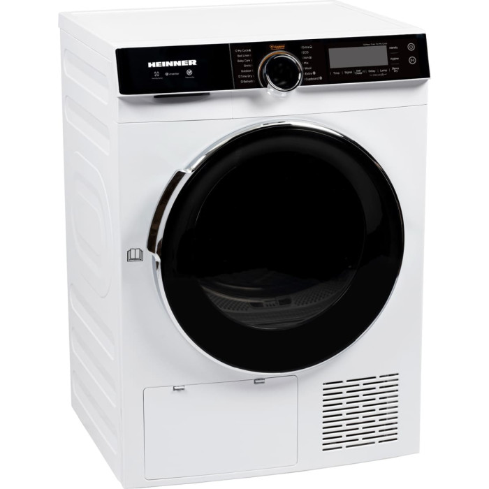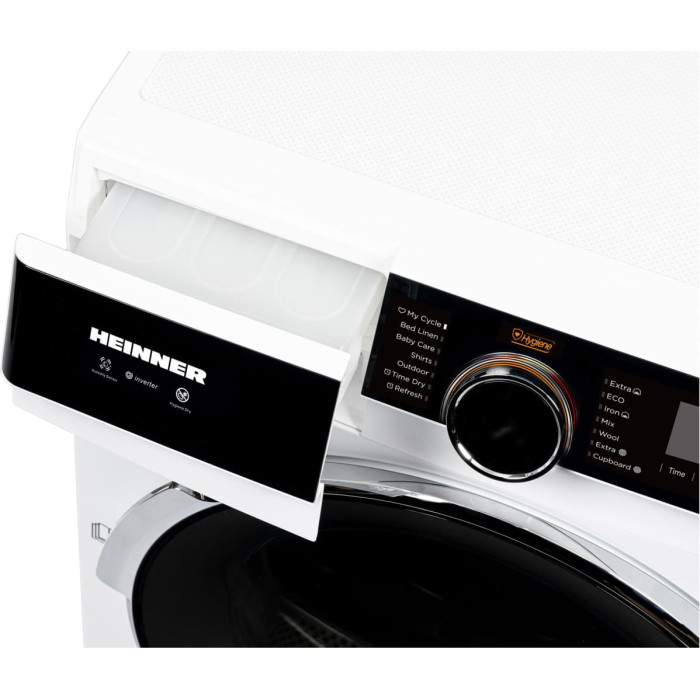 Veļas žāvētājs ar siltumsūkni HEINNER HHPD-M10K3A+++, Ietilpība 10 kg, Energoefektivitātes klase C, Invertora motors, 14 programmas, Skārienjūtīga vadība, Digitālais displejs, Mazuļu apģērba programma, Vilnas programma, Sterilizācijas programma, Pretburzīšanās funkcija, Iepriekš iestatītas programmas atmiņa, Cilindra apgaismojums, Žāvēšanas līmeņa izvēle, Pūku filtra tīrīšanas indikators, Pilnas ūdens tvertnes indikators, Bērnu drošības slēdzis, Izmēri (Dz x P x A): 67.5 x 59.5 x 84.5 cm, Krāsa: Balta